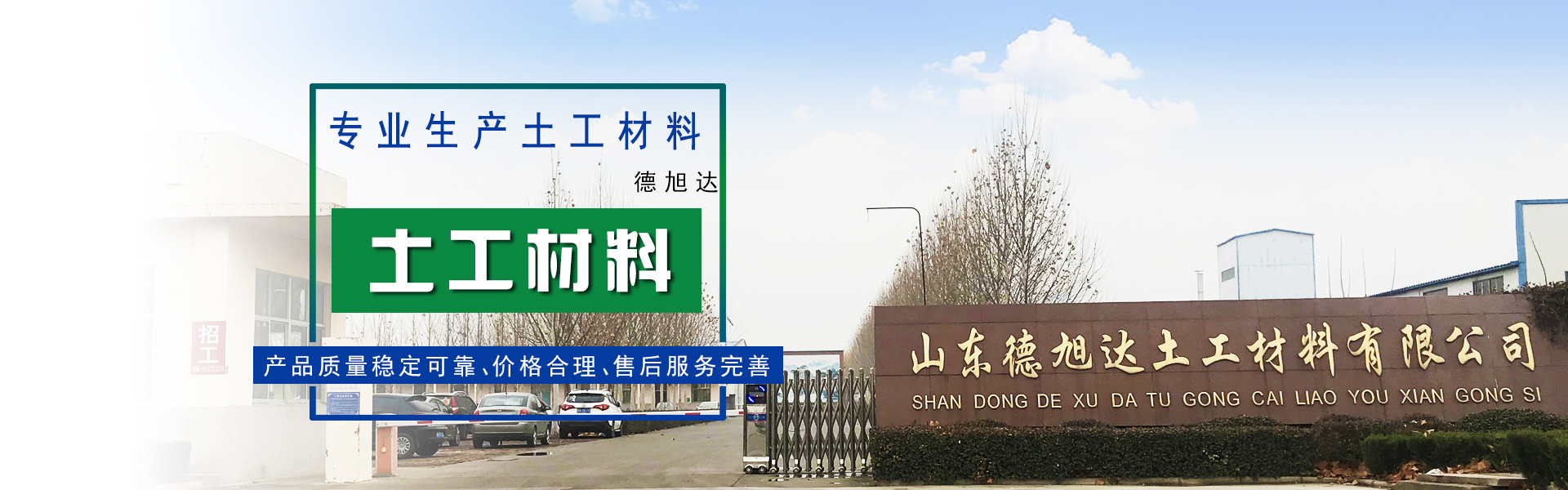 山東德旭達土工材料有限公司是目前規(guī)模較大,品種較全的土工合成材料專業(yè)生產企業(yè),是全國土工合成材料生產基地重點企業(yè)之一,注冊資本為5070萬元,占地面積120畝,現有員工100余人,其中各類專業(yè)技術人員40多人。 地理位置優(yōu)越,交通十分便捷。山東德旭達土工材料有限公司位于西漢大文學家東方朔故里,魯西北著名歷史名城—德州 市陵城經濟開發(fā)區(qū)。京滬高速鐵路依縣而過,京福高速公路、德煙鐵路、京滬鐵...【了解更多】